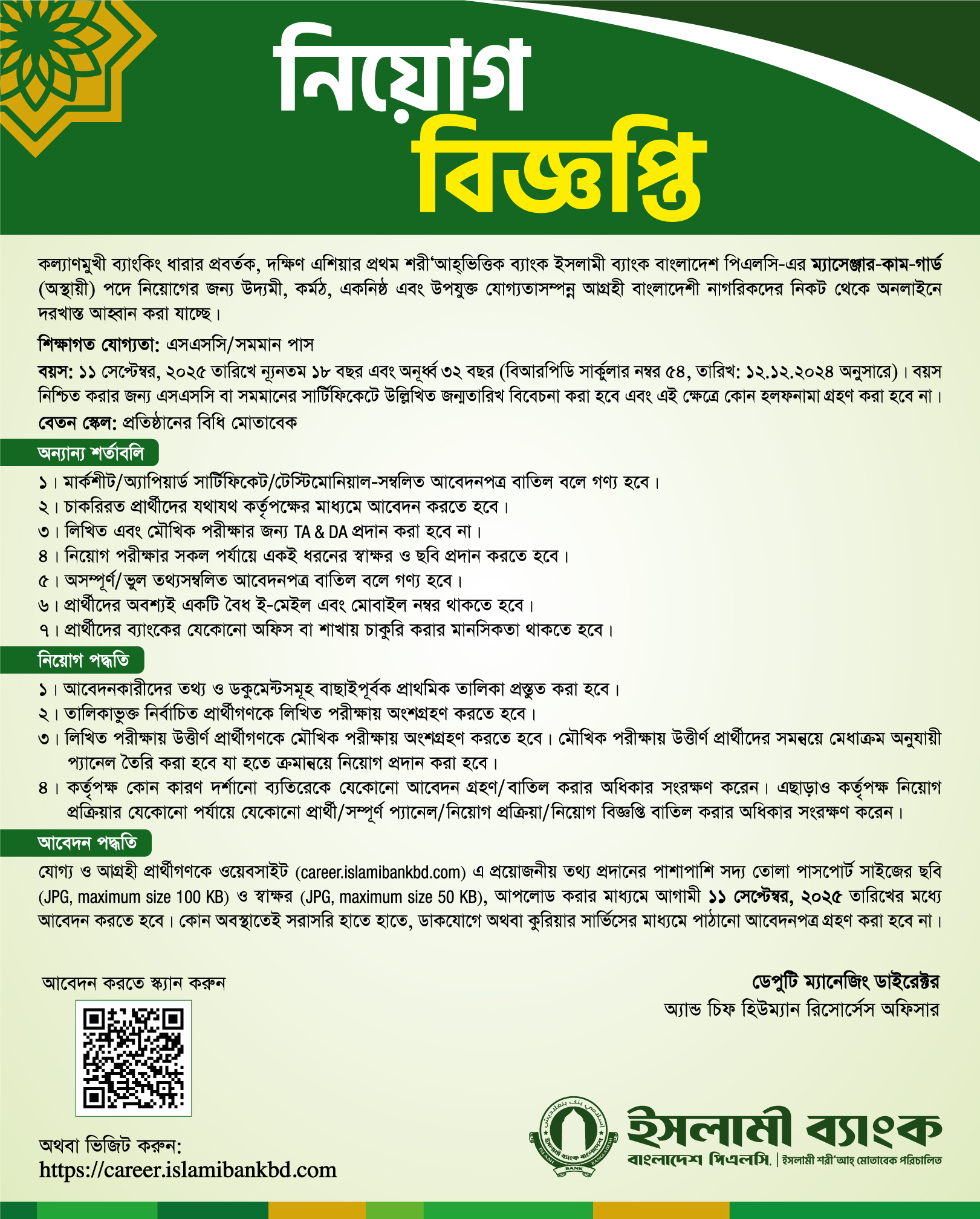 ইসলামী ব্যাংক বাংলাদেশ পিএলসি নিয়োগ বিজ্ঞপ্তি প্রকাশ করেছে। ইসলামী শরিয়াহ মোতাবেক পরিচালিত বেসরকারি বাণিজ্যিক ব্যাংকটি ম্যাসেঞ্জার-কাম-গার্ড (এমসিজি) পদে জনবল নিয়োগের জন্য এ বিজ্ঞপ্তি দিয়েছে। গত ২২ আগস্ট থেকেই আবেদন নেওয়া শুরু হয়েছে। আবেদন করা যাবে আগামী ১১ সেপ্টেম্বর পর্যন্ত। আগ্রহী প্রার্থীরা অনলাইনে আবেদন করতে পারবেন। নির্বাচিত প্রার্থীরা মাসিক বেতন ছাড়াও প্রতিষ্ঠানের নীতিমালা অনুযায়ী আরো বিভিন্ন সুযোগ-সুবিধা পাবেন।