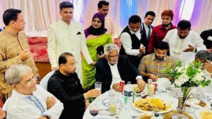এর পাশে বসা ছিলেন বিএনপির চেয়াপারসনের উপদেষ্টা আমান উল্লাহ আমান ও বিএনপির আন্তর্জাতিকবিষয়ক কমিটির সদস্য ইঞ্জিনিয়ার ইশরাক হোসেন। বিএনপির মিডিয়া সেলের সদস্য শায়রুল কবির খান গণমাধ্যমকে বলেন, বিয়ের অনুষ্ঠানে দুই নেতার দেখা হয়। অনুষ্ঠান শেষে দুজন কুশল বিনিময় করেন।