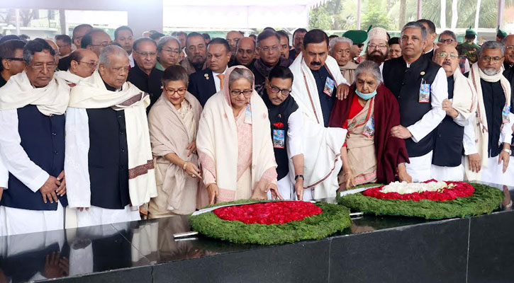 বুধবার (১০ জানুয়ারি) সকালে ধানমন্ডি ৩২ নম্বরের বঙ্গবন্ধু ভবনের সামনে বঙ্গবন্ধু প্রতিকৃতিতে শ্রদ্ধা নিবেদন করেন তারা।
