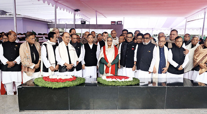 বঙ্গবন্ধুর প্রতিকৃতিতে প্রথমে শ্রদ্ধা জানান প্রধানমন্ত্রী শেখ হাসিনা। পরে মন্ত্রিসভার সদস্যদের নিয়ে পুনরায় শ্রদ্ধা জানান তিনি।