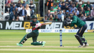 আইরিশদের পেসের সামনে রনি ব্যর্থ হলেও তিনে নেমে কাউন্টার অ্যাটাকে সফলতা পান শান্ত। তার আক্রমণাত্মক ব্যাটিংয়ে পাওয়ার প্লেতে আর কোনো উইকেট না হারিয়ে ৬২ রান তুলে বাংলাদেশ। তবে উইকেটে থিতু হয়েও ইনিংস বড় করতে পারলেন না আগের ম্যাচের জয়ের নায়ক। ১১তম ওভারের পঞ্চম বলটি অফ স্টাম্প থেকে বের হয়ে যাওয়ার সময় শান্তর ব্যাটের কানা ছুঁয়ে চলে যায় প্রথম স্লিপে। সেখানে দাঁড়িয়ে থাকা বার্লবির্নি কোনো ভুল করেননি। তাতে ৭ চারে ৩২ বলে ৩৫ রানে থামতে হয় শান্তকে।